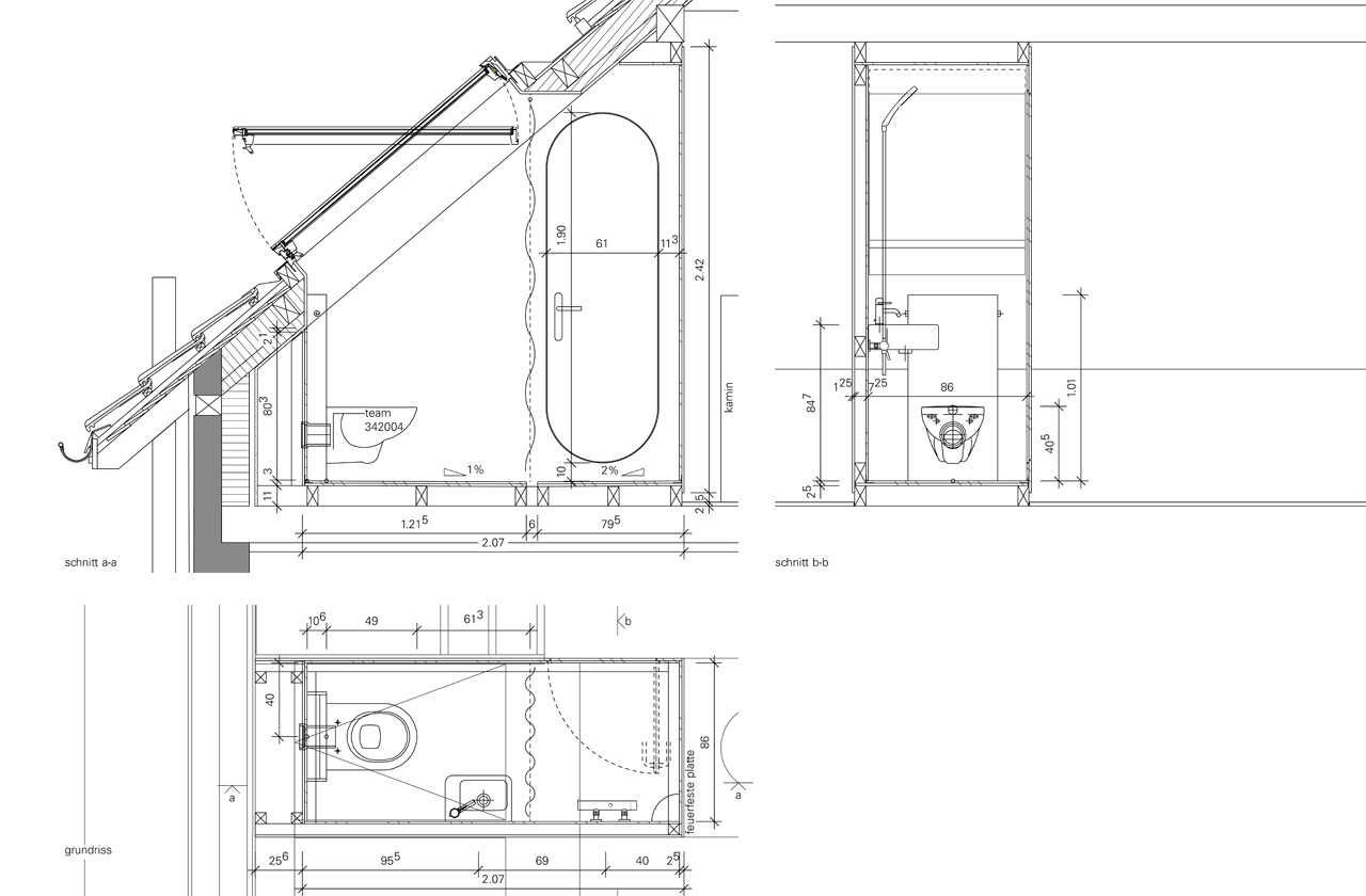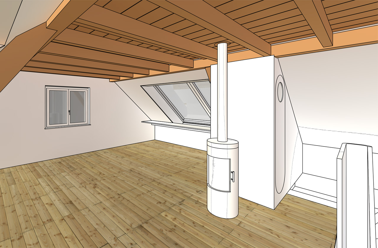 | dachausbau | der zur zeit unbeheizte dachstock soll zu einem mehrzweckraum ausgebaut werden. dazu werden sämtliche einbauten entfernt, auf der nord- und südseite je ein grosses dachflächenfenster eingebaut und eine innendämmung eingebracht. eine kleine nasszelle und eine teeküche erlauben die nutzung auch als studio. die ausführung ist für 2017 geplant. |